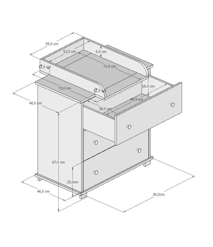 Medžiaga: komoda pagaminta iš aukštos kokybės 18mm storio laminuotos medžio drožlių plokštės