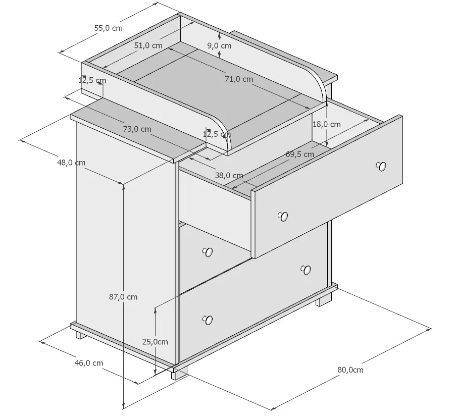 Medžiaga : baldai pagaminti iš labai aukštos kokybės medienos drožlių plokštės. Baldų stabilumą užtikrina keturių taškų atrama ant tvirtų medinių kojų, kas dar labiau padidina jų ilgaamžiškumą. Stalčiai su guoliniais bėgiais